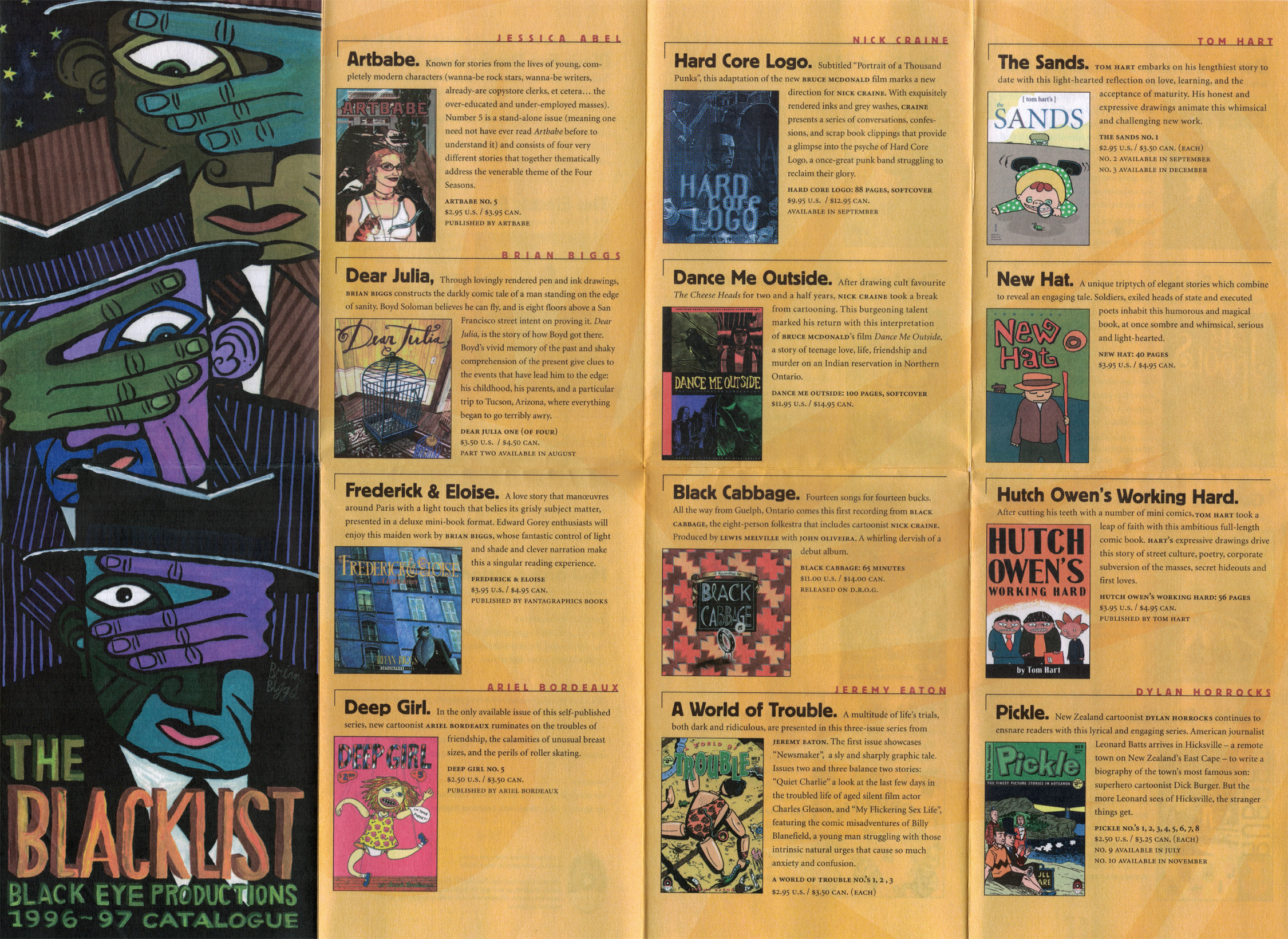 But even though Tragedy Strikes went away, the cartoonists they published all found homes elsewhere. Carol Swain moved her Way Out Strips to Fantagraphics, and both Stephens and Horrocks were there to help launch Black Eye Productions, the new company from former Tragedy Strikes editor Michel Vrana. Black Eye quickly gathered together an impressive roster of cartoonists including Jason Lutes (Berlin), Tom Hart (The Sands), and Brian Biggs (Dear Julia).