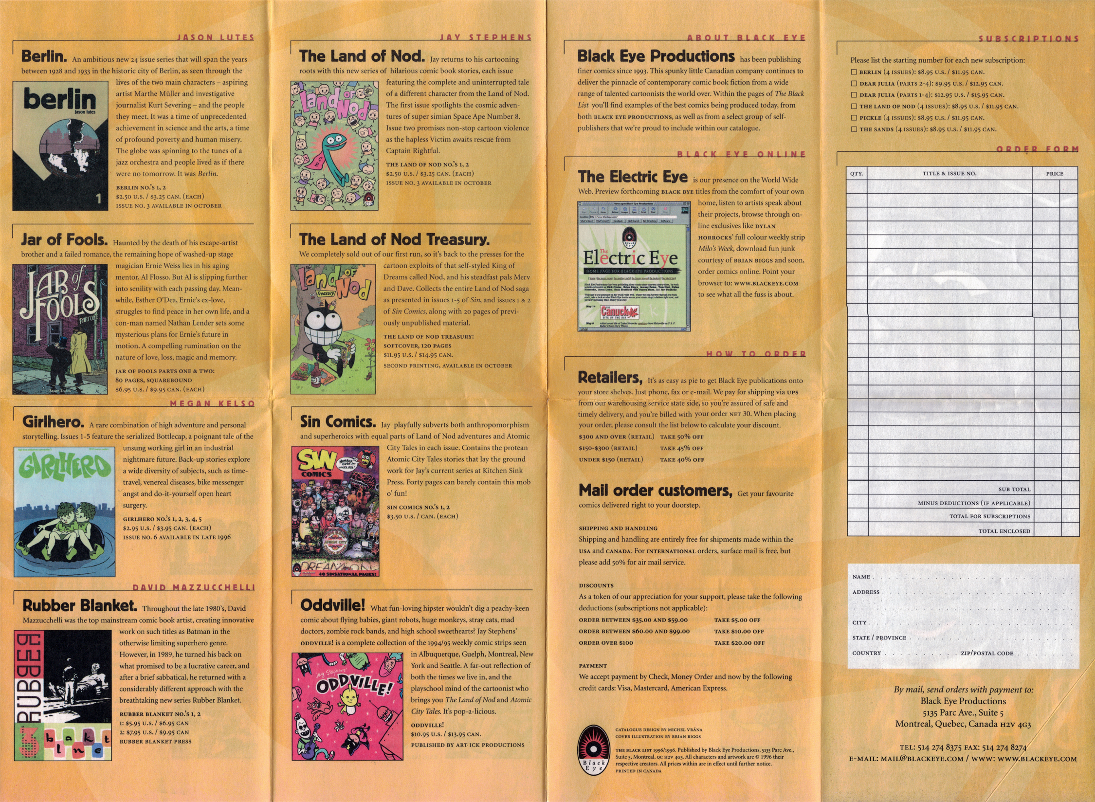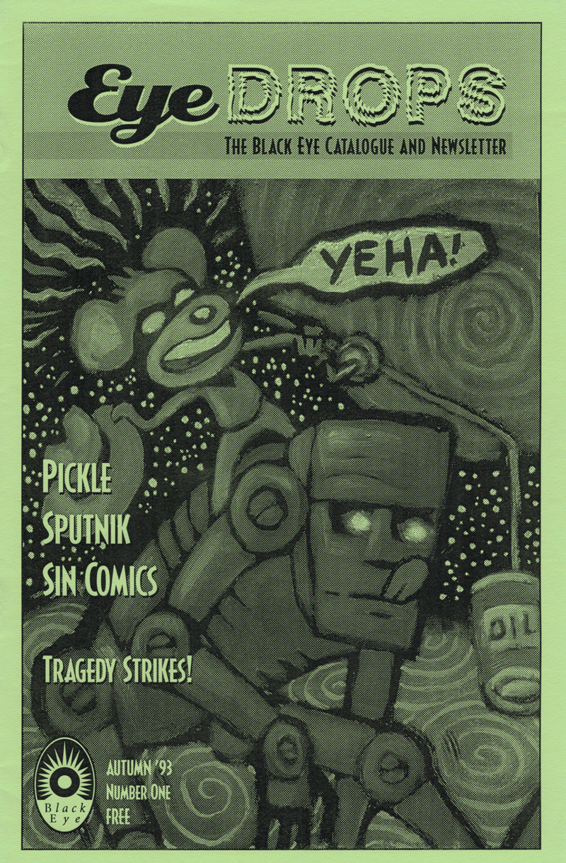The thing that really set Black Eye apart was the crisp look of its line of comics. Vrana is a skilled designer, and his expertise really showed with all visual aspects of the company, from the classy logo and clean trade dress for each comic, right down to the impeccably designed newsletters and catalogs. The company even had an early presence on the Web, with a nicely laid out website that even contained some early online comics by James Kochalka, Jay Stephens, and Dylan Horrocks. Black Eye eventually folded in 1998, but Vrana currently enjoys a successful career as a book designer.