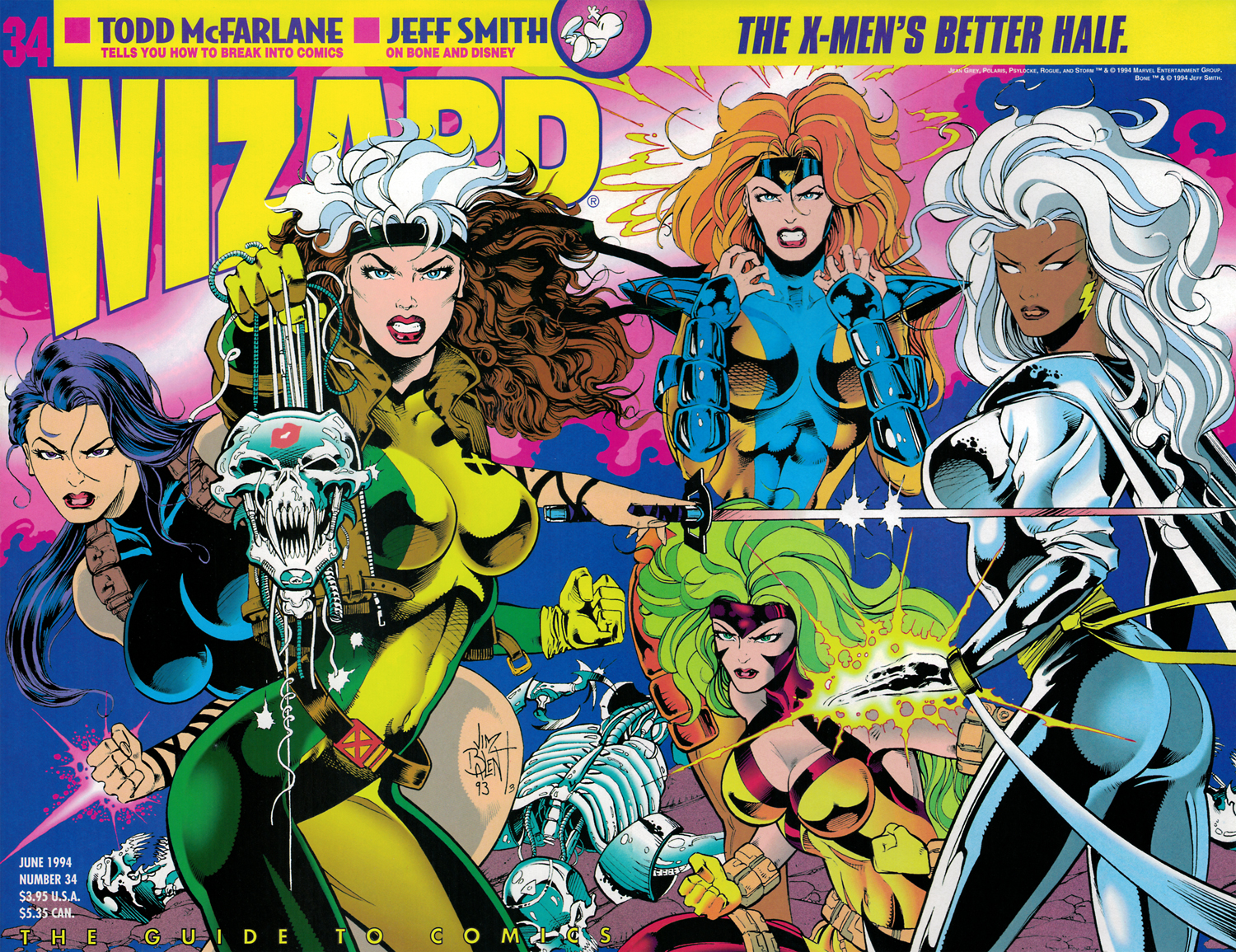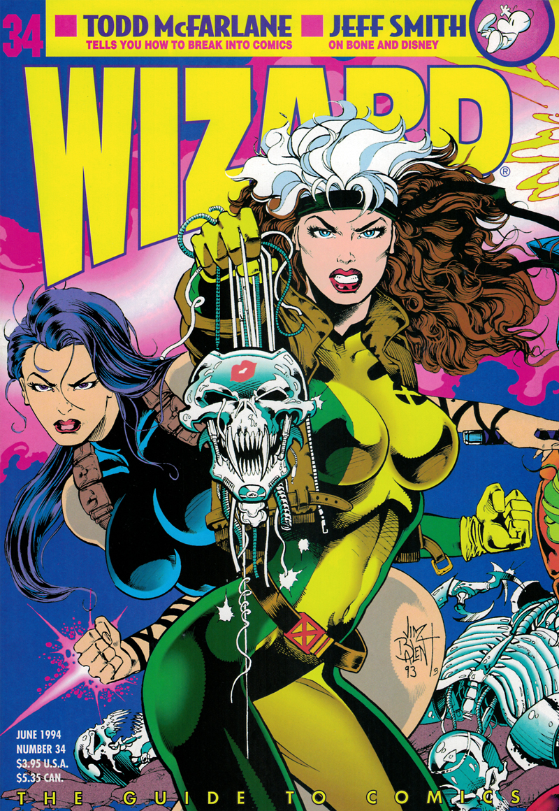 Jeff Smith’s Bone makes an appearance on the cover of Wizard #34. Also, noted T&A artist Jim Balent draws some of Marvel’s X-Women.