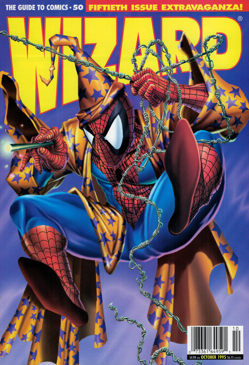 For the cover of Wizard #50, Todd McFarlane’s art from the cover of the first issue was recolored in the style of a Fleer trading card series.