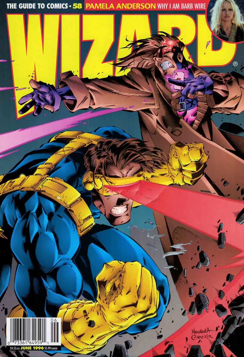 Marvel Comics’ mutants Cyclops and Gambit take the spotlight for the cover of Wizard #58 by Joe Madureira. Check out all of those extra muscles on Cyclops’ upper arm! Reminds me of Johnny Ryan’s “Weight Lifting Gophers” strip from the back cover of Angry Youth Comics #4.